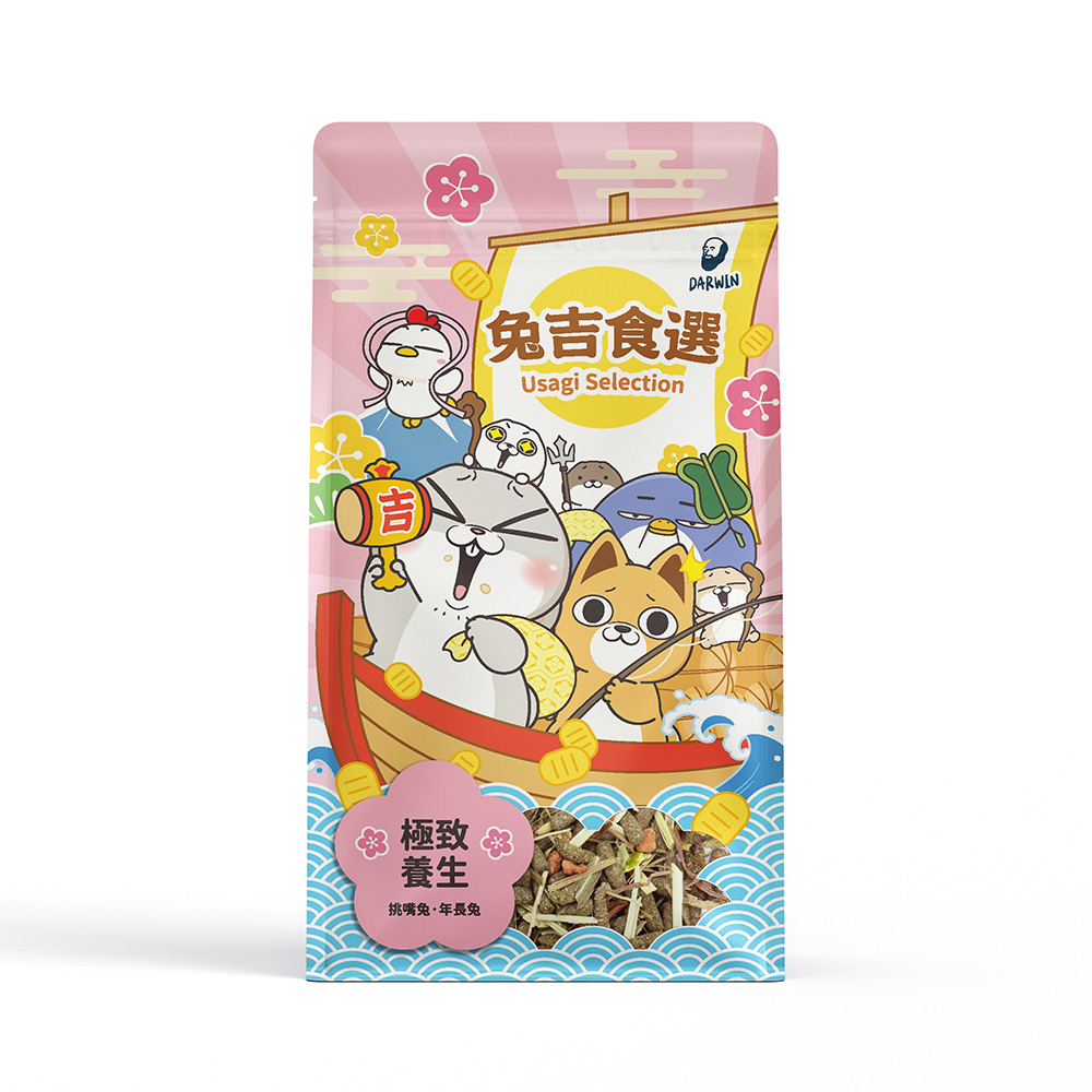 內容物:壓縮兔飼料(乾燥苜蓿、玉米、小麥、黃豆粉、黃豆穀、糖蜜、碳酸鈣、碳酸二氫鈣、甲硫氨酸、綜合維生素、綜合礦物質)、苜蓿草粒、三色藜麥、亞麻仁籽、二割提摩西草、果園草、迷迭香、檸檬草、高麗菜乾、胡蘿蔔乾、枸杞、南瓜丁。